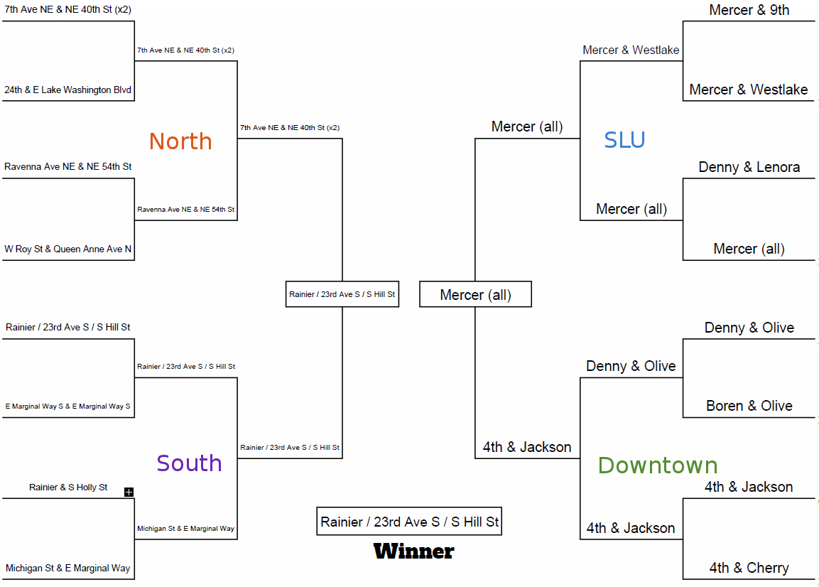 A lack of investment is certainly apparent when you compare this intersection with the runner-up, which was actually several intersections: all of Mercer Street’s intersections in South Lake Union. Mercer St was recently re-built with hundreds of millions of dollars of federal and state money, its lights were re-programmed with tens of millions of city money, and it’s surrounded by buildings that have sprung up as the result of millions if not billions of dollars from private and corporate investors. Of course, these things weren’t done well, which is why Mercer St made it all the way to the finals.