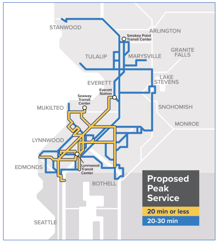 For Community Transit, the launch of Lynnwood Link is a chance to reclaim a significant number of service hours that are currently spent serving Seattle and reinvest them locally in Snohomish County. Bus service on the peak-only network would expand significantly at the same time that frequencies are increased throughout the day on core routes to the county’s biggest destinations. The agency is on track for an all-day frequent network, but in the meantime, places like Stanwood, Lake Stevens, and Marysville will see more bus service that connects to light rail during peak hours.