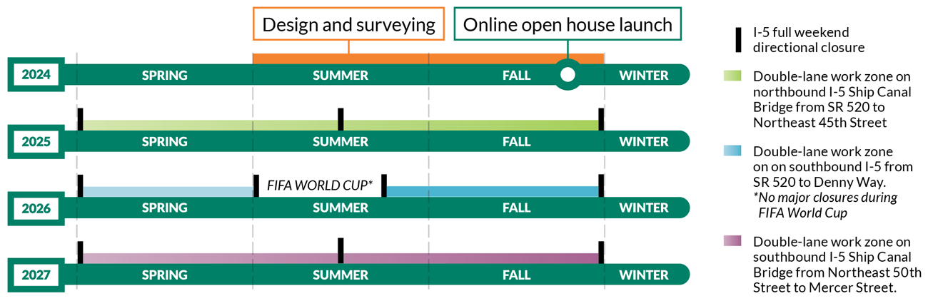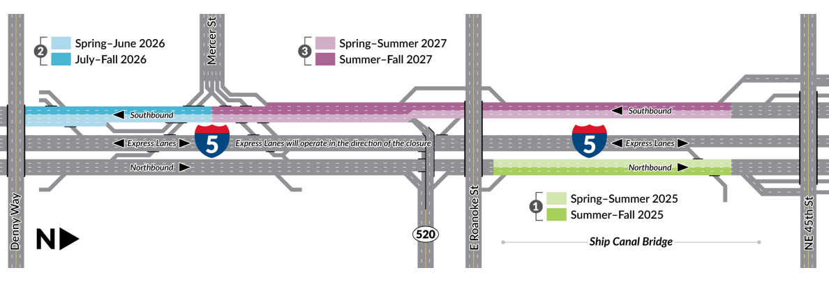 No additional transit corridor upgrades are set to be put in place to sustain riders through the I-5 construction period, though new bus lanes added to 15th Avenue NW in Ballard and Interbay should bring benefits. By the end of 2025 (or early 2026), the Sound Transit 2 Line’s extension across Lake Washington and up to Lynnwood should double train frequencies and provide much more capacity for riders, and construction will be paused during the months surrounding the 2026 FIFA World Cup.