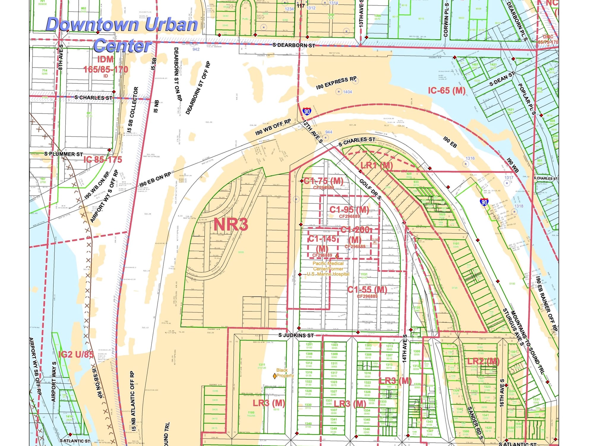 A good illustration of these single-use zones is the C1-200 (M) zone. It is used only once, on an area just less than an acre. The zone only applies to the tall part of the PacMed building atop Beacon Hill and nowhere else in town. Other parts of the same parcel are zoned C1-95 (M), another zone used only here, and C1-145 (M), a designation used only twice, on either side of the same PacMed building.