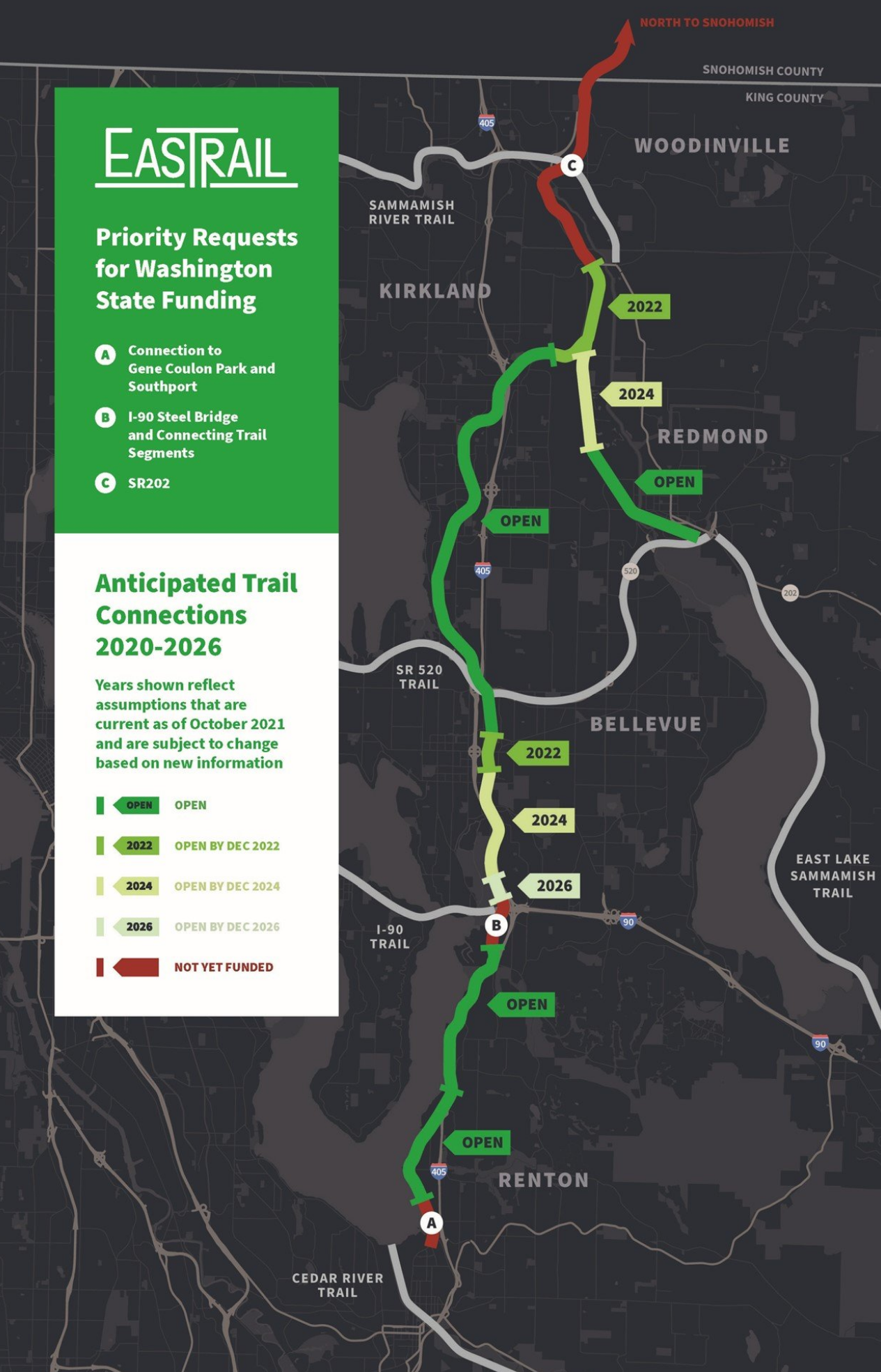 With different parts of the trail owned by different government entities and the sheer numbers of private and public sector partners that have invested in the growth of Eastrail, finding synergistic funding paths is important but challenging. “The model that might have worked in one section of the trail just might not work in another for a multitude of reasons,” Hollis explained. When Eastrail Partners approached State legislators with their funding requests, their strategy in project prioritization therefore needed to be grounded in a two-pronged approach.