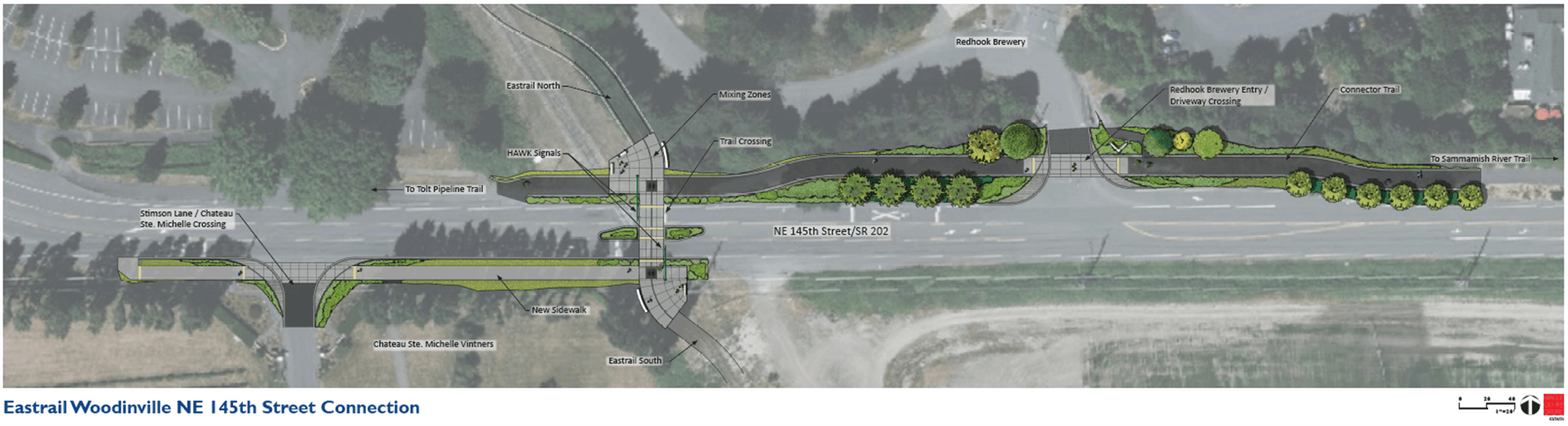 The projects cited earlier, which Eastrail Partners helped facilitate, are strong evidence that the organization can make this synergistic approach between stakeholders in the private and public sectors work. And although additions to the trail happen in a piecemeal fashion, these projects often complement each other in ways that increase the utility of the whole trail system. For example, Hollis was excited to show me a satellite map of a soon-to-be open trail segment near the Chateau St. Michelle Winery. A portion of Eastrail connecting northeast Kirkland with southern Woodinville is slated to open this summer, so the City of Woodinville has been working on a dedicated off-street path (set to open at a similar time) that will facilitate connections with the nearby Sammamish River Trail. Users can then travel south towards Redmond or north towards the Burke Gilman Trail and Seattle.