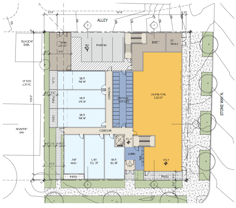 The preliminary design looks promising with an inviting patio space for a future restaurant. The awnings and balconies provide a nice horizontal element. More details will come out as the architects move beyond early design, but the project looks like it’s well on its way. The sparing use of parking is commendable. No parking is required because the site is near frequent transit and within the Wallingford Residential Urban Village.