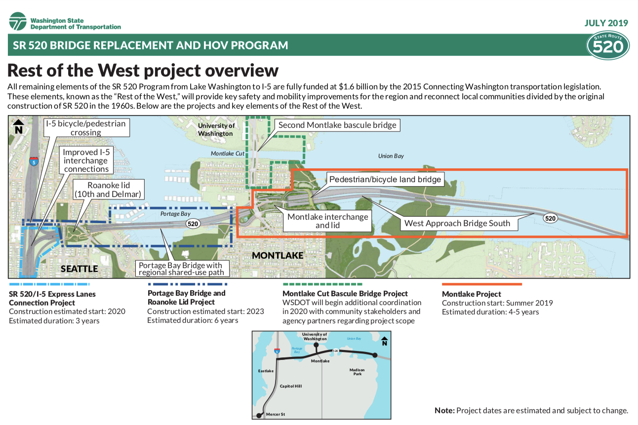 As project crews prepare to break ground this summer on the Montlake Project elements of Rest of the West, the continuation of WSDOT’s multibillion dollar remake of SR-520 between Seattle and the Eastside, the agency is beginning community outreach on its design plans for a new Portage Bay Bridge and Roanoke highway lid.