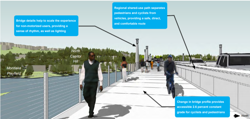 Like the Montlake Project elements of Rest of the West, the new Portage Bay Bridge and Roanoke highway lid are planned to build highway traffic capacity while adding new multimodal connections. The new widened bridge will include the final SR-520 stretch of dedicated transit/high occupancy vehicle (HOV) lanes in each direction. These lanes have been designed run from South Lake Union to Redmond, connecting two technology job centers. It will also expand the regional shared use path that runs along the entire SR 520 corridor. A new 30-foot-wide shared-use crossing over I-5 is also planned, along with bicycle and pedestrian connections that will run through the Roanoke lid that will cover the highway beneath 10th and Delmar.