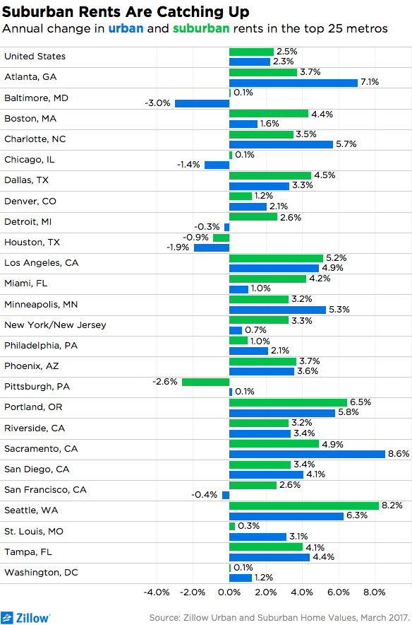 A major watchword for housing advocates is the suburbanization of poverty, and that could be playing out in the homelessness statistics. Southwest King County, which is considered an escape valve for people priced out of Seattle, is second behind Seattle with 1,102 unsheltered and 915 sheltered homeless people. Unfortunately, the rent relief folks moving to the suburbs seek may be short-lived. Zillow’s recent report with March 2017 data showed median rent growth in Seattle’s suburbs outpacing the center city at an 8.2% increase versus 6.3% in urban areas. Note that high median rents don’t necessarily indicate skyrocketing rents at the bottom of market, but, over time, low-level rents tend to track with median rents, generally speaking. Thus, high rents in Seattle pushing people to the suburbs, where rents are climbing even faster could be a recipe for disaster and another way to make sense of a 21.7% increase in homelessness.