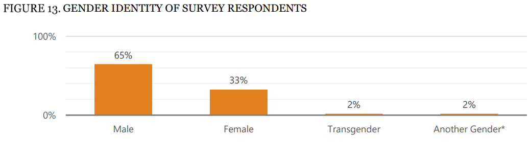 Men made up a much larger portion of the survey than women: “Sixty-five percent (65%) of survey respondents identified as male, 33% identified as female, 2% identified as transgender, and 2% identified as another gender (e.g. gender-queer, gender non-conforming, or non-binary).” King County Department of Community and Human Services Director Adrienne Quinn connected the greater prevalence of male homelessness with the reluctance to build men’s shelters compared to shelters for women or families. Bellevue’s wrangling over an Eastgate homeless shelter is a recent example of opposition to men’s shelters, which likely will delay the project with extra hurdles like studying two additional sites.