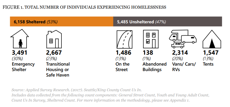 The results of the annual One Night Count, which was conduced on January 27th, have finally been released and they show homelessness at an all-time high. The King County unsheltered population has climbed to 5,485. Meanwhile, volunteers counted 6,158 people in shelters or transitional housing. That shows a 21.8% increase from last year’s count of 4,505 unsheltered homeless folks, which in itself was a 19% increase from the 2015 count. 2015’s unsheltered count was a 21% increase from 2014.