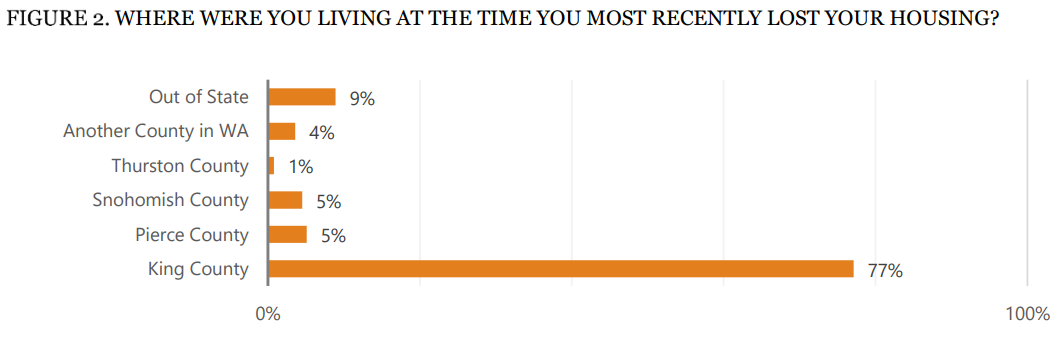 Another takeaway is that most of the homeless population were most recently housed in King County rather than arriving homeless from other areas. Only 9% lost their housing in another state.