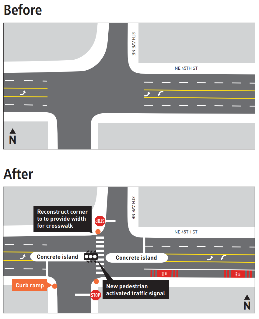 A block into our eastward movement in the U District, SDOT has unveiled a new proposal to the Route 44 corridor that goes beyond the 30% design proposal. These improvements look to significantly improve conditions at NE 45th St and 8th Ave NE, where a new crosswalk is proposed across NE 45th St, a traffic signal is added, two stop signs are added, a concrete island is added, curb space reconstruction is proposed, and so are new curb ramps. The proposal looks to prevent drivers eastbound from turning left and westbound from turning left onto 8th Ave NE, greatly increasing pedestrian safety and access. A bus only lane also manages to sneak into the picture eastbound after 8th Ave NE.