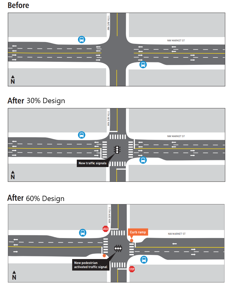The biggest change between 30% and 60% design in this segment is to the intersection of NW Market St and 11th Ave NW. Two new curb bulbs seem to have been added to the design in order to shorten the crossing distance for pedestrians, and increase pedestrian visibility for incoming traffic. SDOT also notes that this update will provide more space for traffic signal infrastructure, which includes two stop signs on 11th Ave NE. New curb ramps for the proposed curb bulbs are included too.