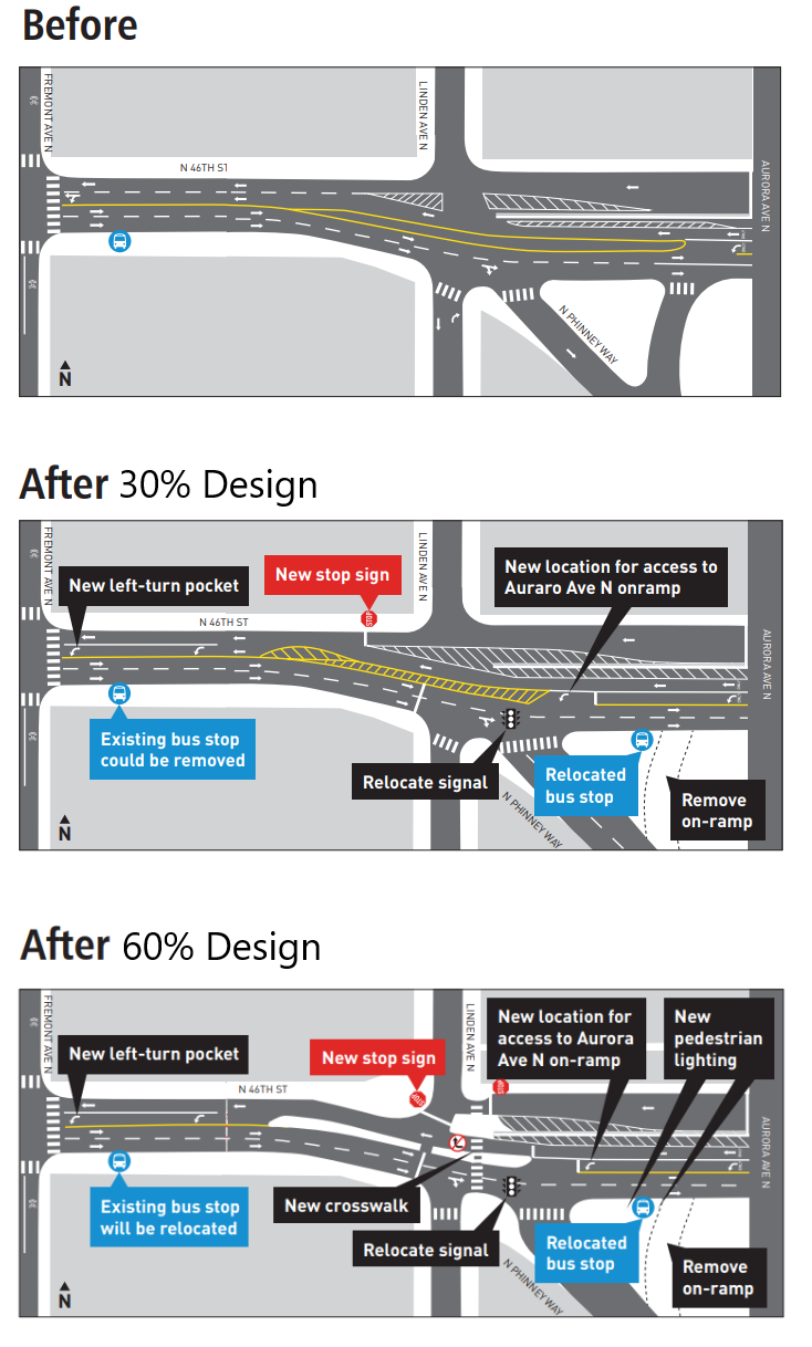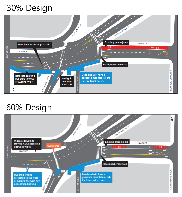Next, on N 46th St at Green Lake Way/Whitman Ave N, SDOT decided to scrap the odd proposal for widening roadway to add an extra eastbound lane between Aurora Ave N and Green Lake Way N. Apparently, in-depth analysis of the widening determined that it would not provide significant transit benefits, and it also found that channelization and signalization changes could produce similar and cheaper results. There’ll also have to be overhead wire modifications, new pedestrian lighting, a shifted crosswalk, and a widened sidewalk for ADA requirements.