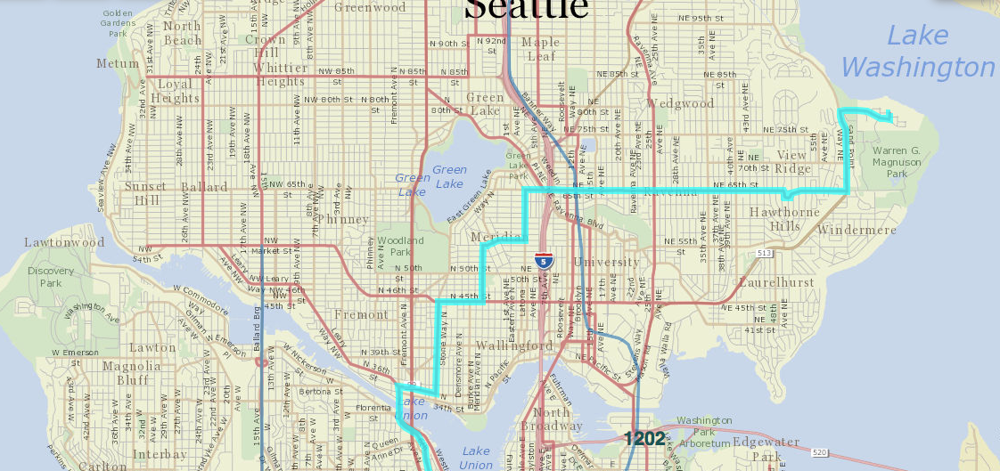 A simple 65th Street RapidRide from Puget Sound to Lake Washington is complicated by Green Lake being smack dab in the middle. A route could simply wrap around the lake before returning to 65th Street in Northwest Seattle; however, that alignment would also bring it close to the planned 44 RapidRide perhaps duplicating service somewhat.