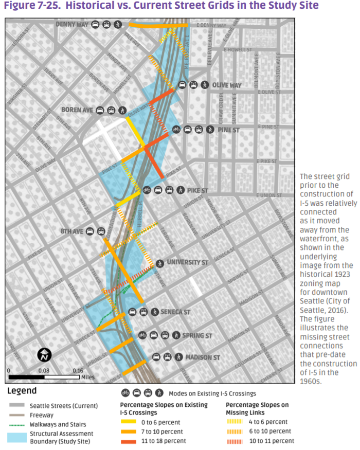 One finding that surprised me was how much a lid would help with stormwater and runoff management. “Approximately 30 percent of the Capitol Hill basin runoff could be treated or retained on the lid, reducing runoff and pollution to the waterways and reducing excess demand of the existing infrastructure and sewer system,” WSP said in the report. “An I-5 lid project could also explore the opportunity to treat currently untreated runoff from I-5 itself.” With recent revelations of how much salmon and other aquatic life are suffering from roadway runoff due to tire particles and other toxic compounds that leach into the water, this could be a huge environmental benefit.