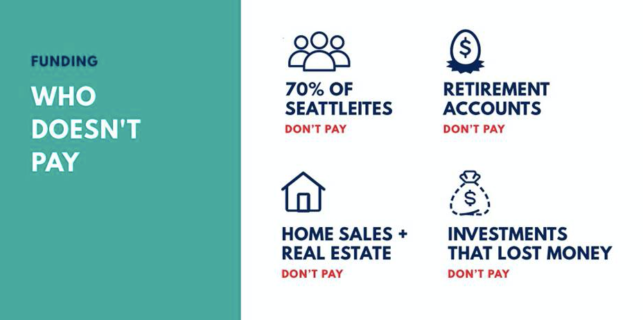 potentially too controversial; however, according to reporting by Nathalie Graham at The Stranger, that decision might present its own complications. In her article, John Burbank, the executive director at the Economic Opportunity Institute, which supported Seattle’s wealth tax, was quoted as saying “the exclusion of real estate may also create a legal challenge because according to the constitution, a tax must be uniform across a class.” It is hard to imagine how a real estate exclusion would stand up among other forms of income.