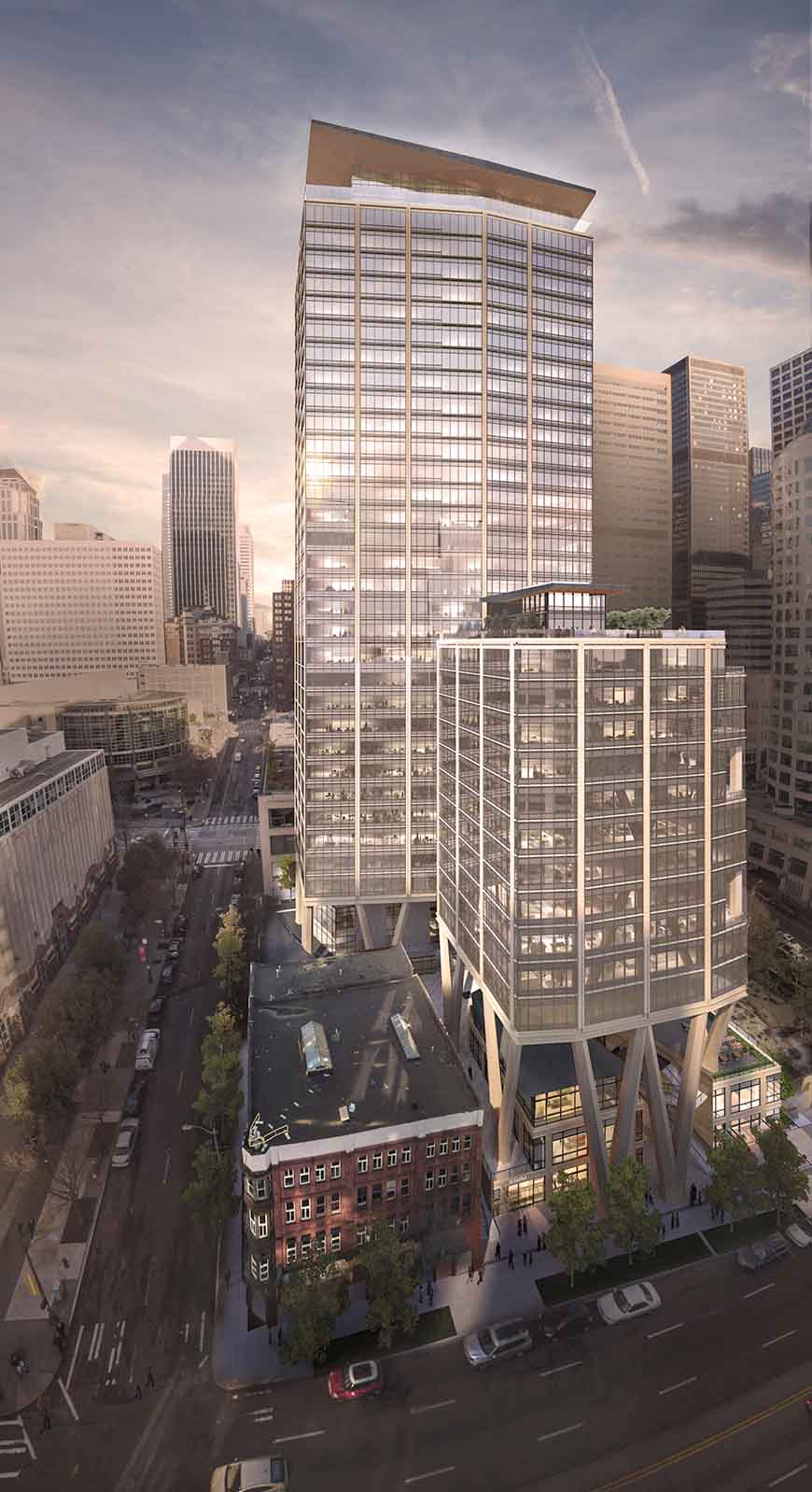 The 2&U building, recently renamed Qualtrics Tower, is a soon to be completed 38-story building with 671,000 square feet of office space, 18,500 square feet of retail, and 476 parking stalls. The developer, Skanska, hired an out-of-town architect to design what they hoped would be a unique to Seattle building and that is what they got. While the upper stories are handsome if unremarkable, the base is raised several stories above the street level to create a retail village with lots of public space designed by local stars Graham Baba, best know for Melrose Market, Chop House Row (in collaboration with Sundberg Kennedy Ly-Au Young Architects) and the Starbucks Reserve Roastery. The columns that the upper office level rest upon provide a dramatic backdrop for the retail village. Time will tell whether the retail will become a lively spec like Melrose Market, or another mostly vacant corporate plaza as seen in many of its neighbors.