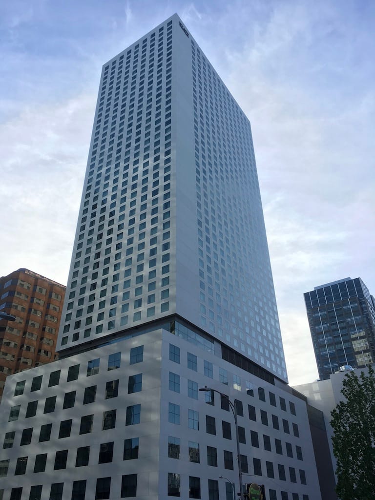 Speaking of order and rhythm, 808 Howell takes that to the extreme. The building has generated 1,264 hotel rooms and meeting space packed into 45 stories of white stone facade and floor after floor of seemingly identical windows. It is a divisive design. I personally love its relentless order, but I have heard other who think it is simplicity is overwhelming. This is also an example of where what matters is the base. At the street level the endless rectangular windows give way to an almost solid white podium with one massive multistory corner window, a very bold move, before becoming transparent at the highly open street level.