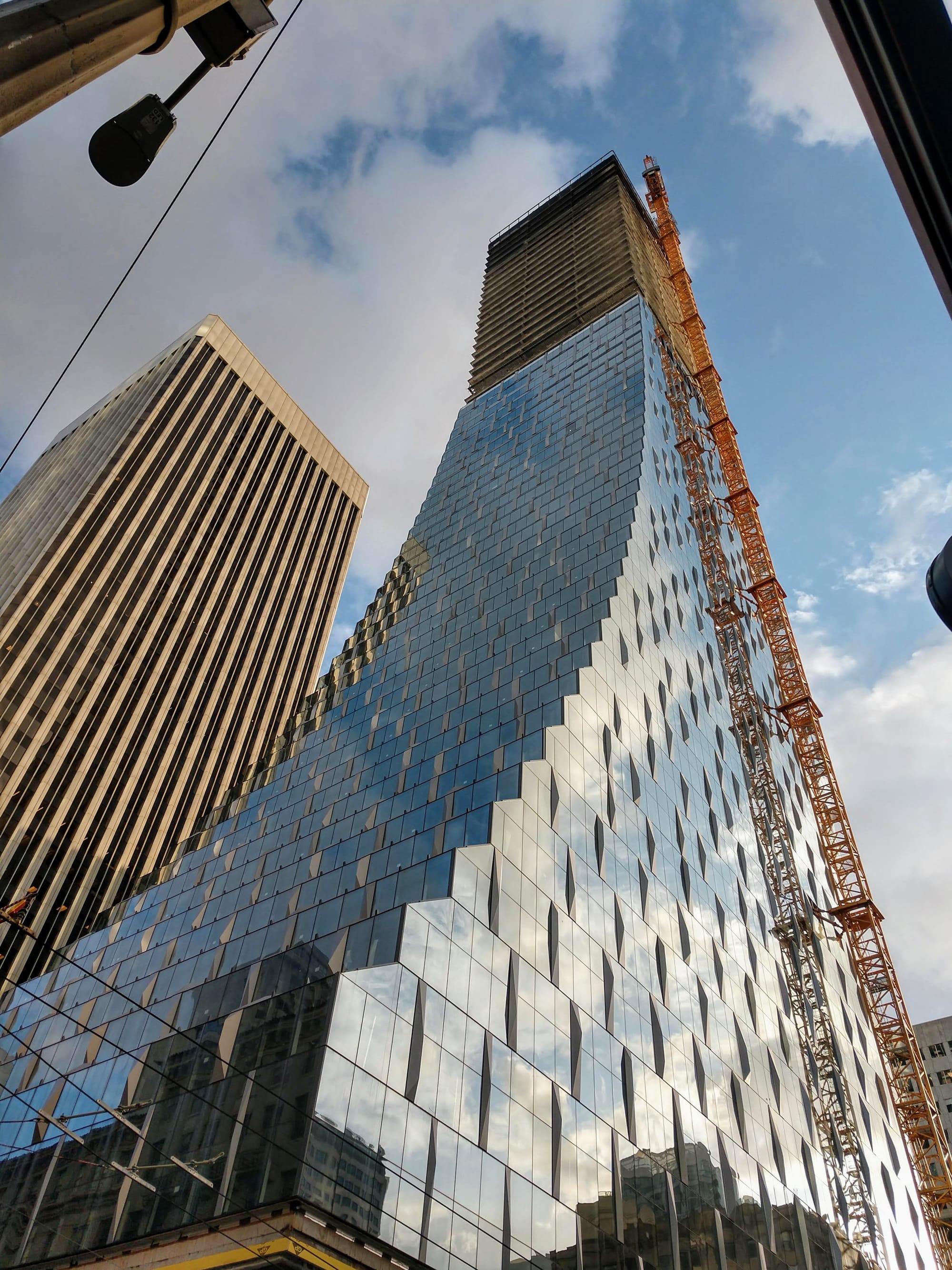 This is my favorite building completed thus far in this cycle. The 43-story F5 building contains both 798,000 square feet of office space and a hotel. It also did this while restoring the sanctuary of the historic First United Methodist Church. It is elegant and sculptural, using subtle plane shifts and an expressive angular crown to make the building appear like a shard rising from its stone face plinth.