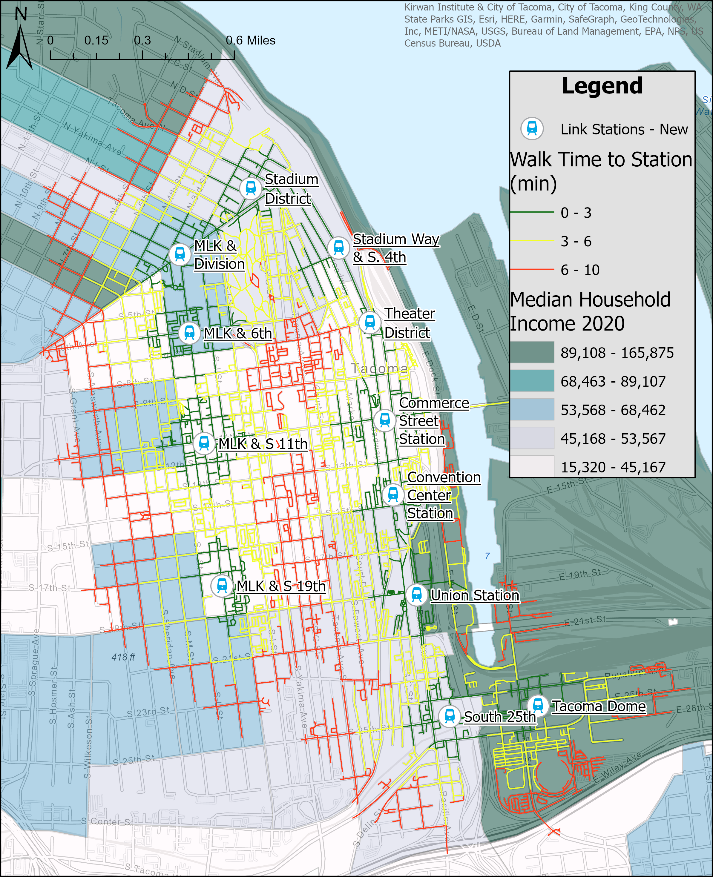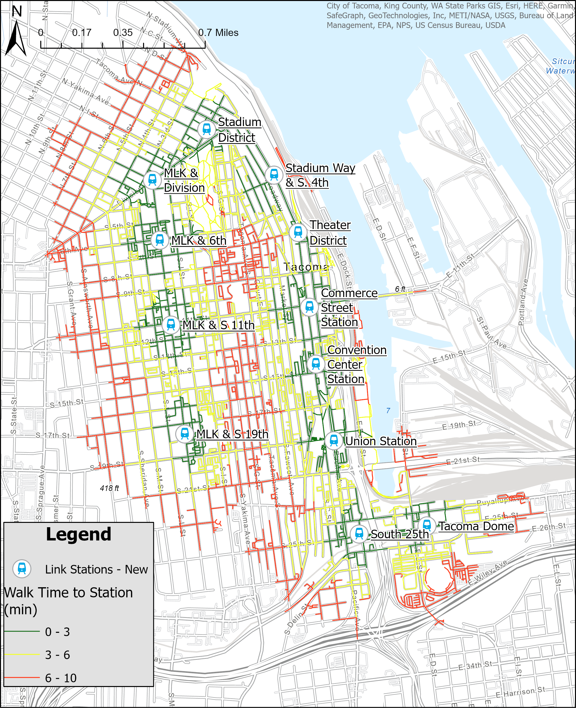 Right away, we can see how much larger of an area is covered by the extended network than the original. In the original, we can see that the reach is limited to Downtown. On top of that, many of the areas within a quarter mile of the existing stations are commercial and industrial areas, which are often destinations. There are multiple residential neighborhoods in that quarter to half mile distance to the west of the stations, meaning people must walk past destinations to access the network. Further, the likelihood of a resident utilizing a transit network is partially dependent on distance, creating a barrier of use if the stations are poorly placed or not extensive enough.In the extended map, we can see that the new stations double the coverage, extending into residential areas along Martin Luther King Jr. Way. These new stations also include ones near Tacoma General and St. Joseph’s Hospitals, allowing Downtown, Stadium and Hilltop residents unprecedented access to healthcare services.Now these maps are great and all, but they are still deficient. These walksheds are “as the bird flies.” I don’t know if you know this, but humans cannot fly on our own (not yet anyways!). These maps are good for exploration and getting a broad overview of the situation and patterns, but we must dig deeper to really assess the new stations’ impact on walkability and connectivity!As mentioned above, the Network Analysis layer includes the road network because that’s what we use to get around! Whether by foot or vehicle, most human travel occurs along the road network connecting all of our front doors. Check out the service areas I created for the old and new T Line networks below:I followed the same logic as the straight line distance analysis, creating cut off distances at 0.1, 0.25 and 0.50 miles. The resulting maps display these distances as walk times rather than distance. These times assume a walking speed of about 0.62 miles per hour (1 kilometer per hour), much slower than the average walking speed of 3-4 miles per hour. Thus, this is a very conservative analysis and the full reach of the expanded network may be a tad larger. Broadly, 0-3 minute walking time represents about 0.1 miles in distance, 3-6 minutes about 0.25 miles and 6-10 about 0.5 miles. Regardless, these service areas are very insightful as we can see the paths people may take and the specific streets that may be just out of reach of the station walksheds. Like with the straight line analysis above, we can see the original network was a primarily Downtown network, serving those residents and connecting them to those businesses and services.Looking at the expanded map, we can see a huge growth of coverage. Basically, wherever you see colored lines is no more than a 10 minute casual stroll from the nearest streetcar platform. That’s pretty incredible! This extensive coverage allows unprecedented access to Downtown, allowing residents from neighborhoods outside of Downtown to more easily patronize those businesses and services and vice versa.