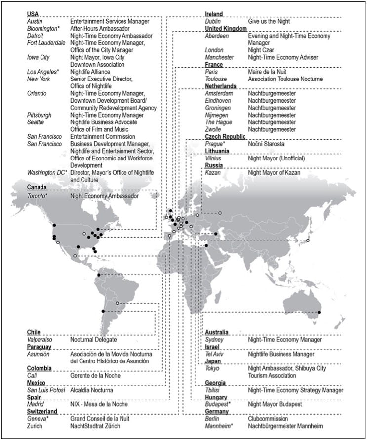The research emphasizes the liaison nature of the night mayor position. Across the three dozen cities the study found hosting such a role, the researchers considered it noteworthy that night mayors “promote mediation rather than regulation to solve urban issues after dark.”