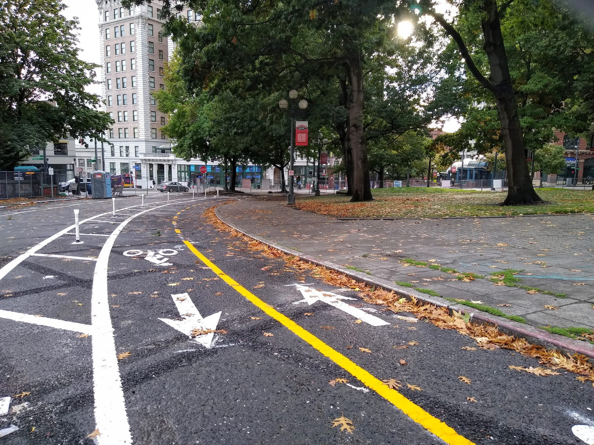 In what will be a counterintuitive move for many riders, the bike lane takes a detour away from 4th Avenue at Dilling Way, the roadway on the south end of City Hall Park. That segment of the protected bike lane (PBL) is temporarily closed with the rest of the park, with a temporary detour set up in the alleyway between the King County Courthouse and the park.