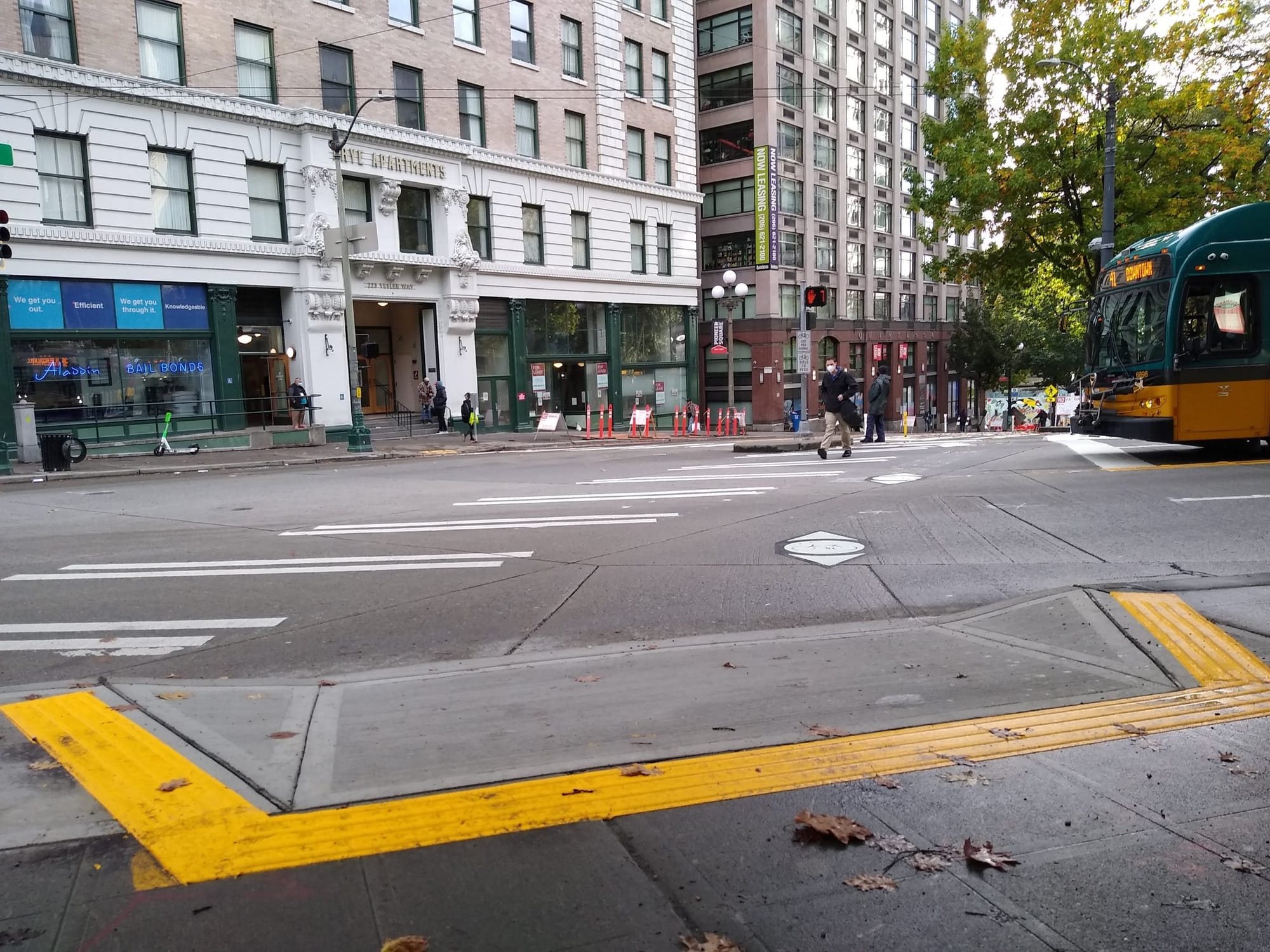On the east side of 3rd Avenue, people on bikes are directed onto the sidewalk, which has been repaired in that area with wide custom curb cuts added. A slip lane from northbound 3rd Avenue onto Yesler Way has been closed, a benefit to all people walking, biking or rolling through that intersection.