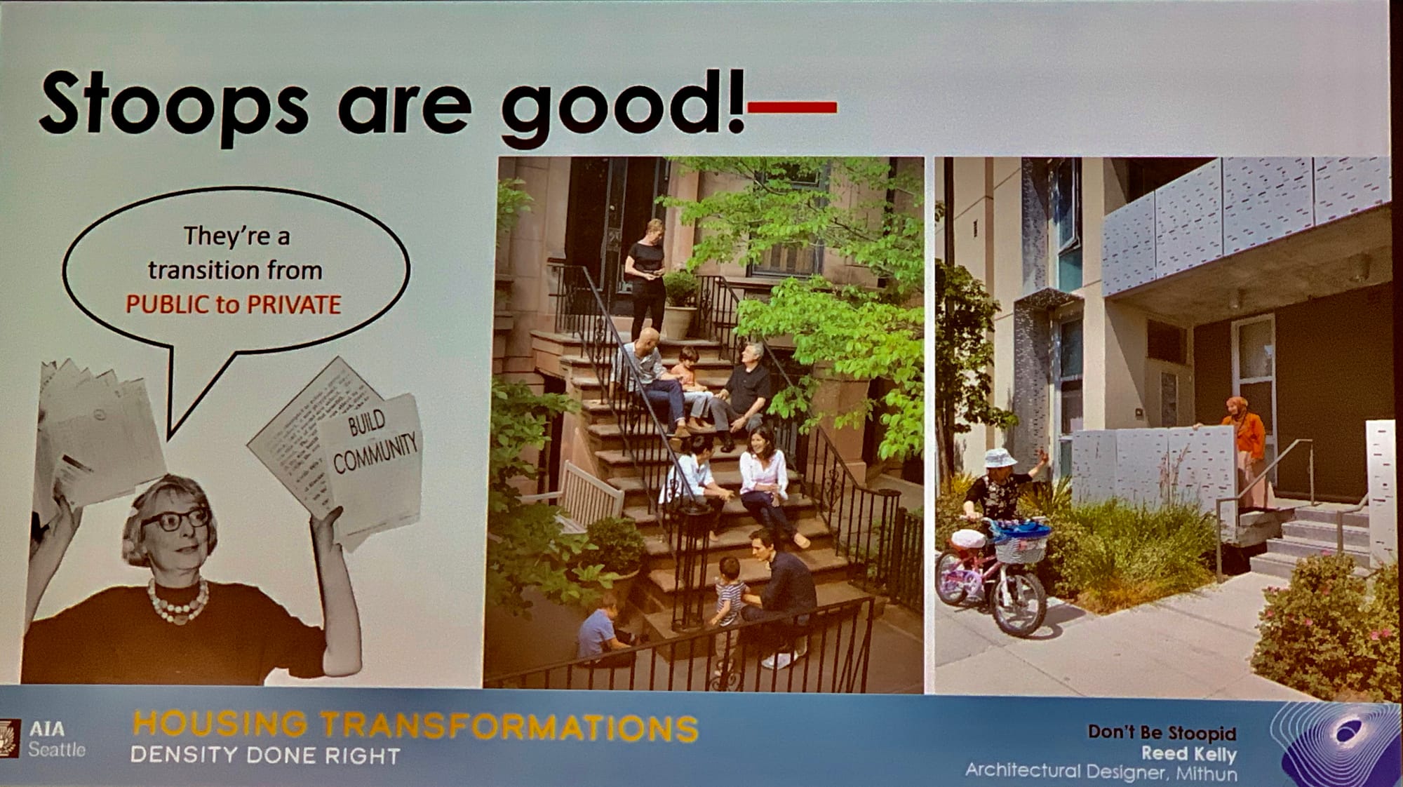 A series of lightning talks on topics specific to density in Seattle added further detail to the discussion. Highlights included a plan for a new walkable Aurora Avenue, which presenter Ryan DiRaimo has previously written about for The Urbanist, and a presentation by Reed Kelly on best practices for designing stoops that enhance both life on the street and individual residences.