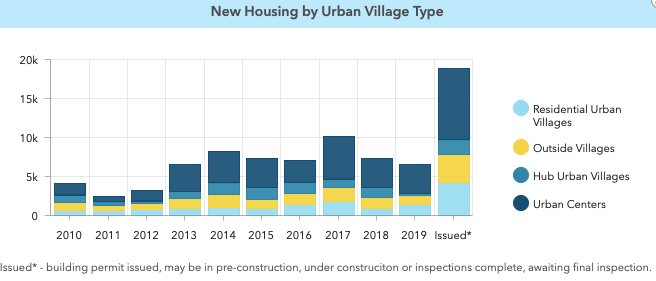 Under Seattle’s current zoning policies, urban centers and villages have absorbed the majority of housing growth, a trend that has increasingly come under scrutiny in part because funneling growth into a small amount of land zoned for larger structures does not open the door for increasing “missing middle” housing, like townhouses, rowhouses, and small apartment buildings, which are often more affordable housing options.