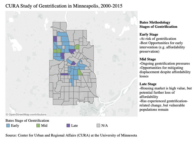Some of Minneapolis’s bolder strategies for increasingly housing supply and affordability include allowing multifamily housing on public transit routes and allowing triplexes in neighborhoods that contain primarily single-family homes. Displacement is also an issue in Minneapolis, where many neighborhoods are entering what the City defines as “early stage” gentrification. While Minneapolis is implementing targeted anti-displacement policies, the steps they have taken so far are not as bold the zoning changes they have implemented. Minneapolis currently appears to be trying to get ahead of the supply side of the affordable housing curve in a effort to prevent displacement before it occurs, but officials are increasingly acknowledging that increasing housing supply is not a panacea. “Minneapolis is trending toward becoming a cold San Francisco, and that’s not a pretty sight,” said Heather Worthington, Director of Long Range Planning at the City of Minneapolis.