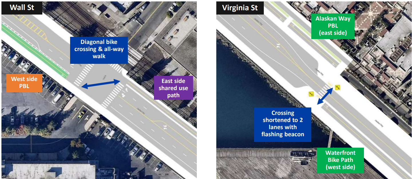 SDOT showed early plans for the transition points for riders to switch sides of the street. The southern transition point at Virginia Street includes a narrowed street as planned with the Waterfront project, with bike riders using the crosswalks to transition, while at Wall Street people on bikes would cross diagonally while pedestrians cross all ways.