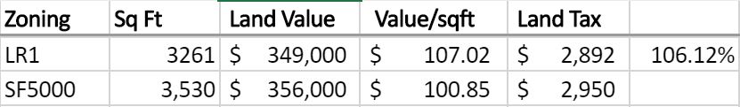 In this case one parcel is SF 5000 and the other was zoned many years ago to LR1 (or more likely the single-family parcel was downzoned in one of our many downzones over the decades). The net impact to property tax? The LR1-zoned parcel pays 6% more property tax per square foot of land. This isn’t nothing, but for an upzoned parcel, a one-time minor bump in tax is hardly “economic displacement”. Were the SF 5000 parcel to be upzoned to LR1, the homeowner might see a $180 increase in property tax. (Note that this isn’t 6% on the entire tax bill, but just on the value of the land.)