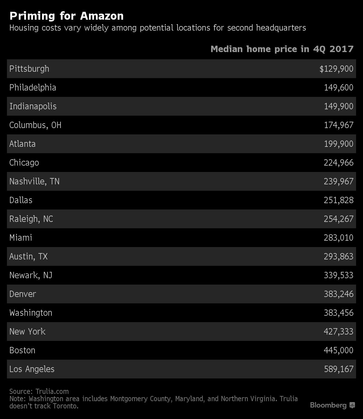 Of the finalists, only Toronto is outside the United States. Toronto accomplished this without offering tax subsides to the online retailing giant, which suggests that Toronto’s bid had other fundamental advantages–e.g., Canada’s saner immigration policy. Potentially the lack of tax break goodies could mean other cities will win the race to the bottom, looking at it more cynically. That said, Canada offers universal health care and a lower corporate tax rate. Of the 20, only Los Angeles represents the West Coast, which adding weight to reports that Amazon was looking to build “HQ2” in a different time zone.