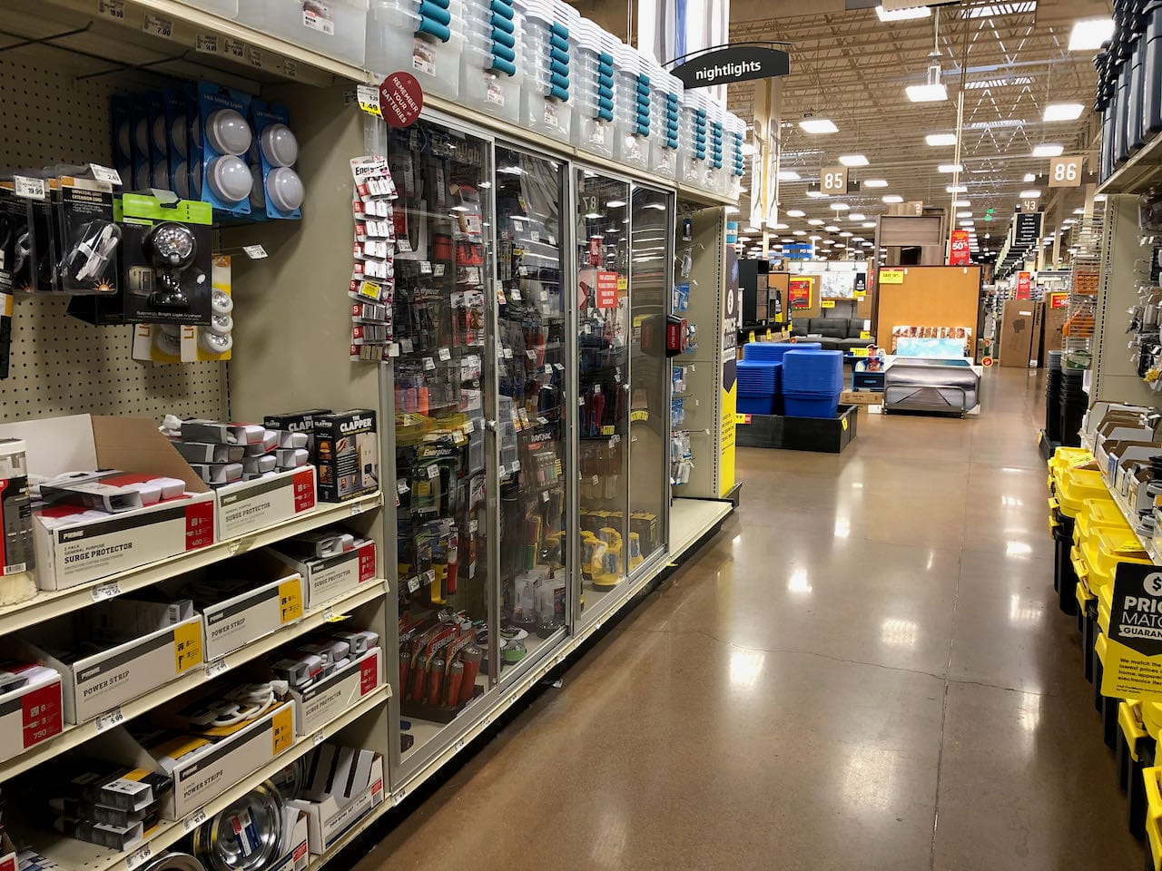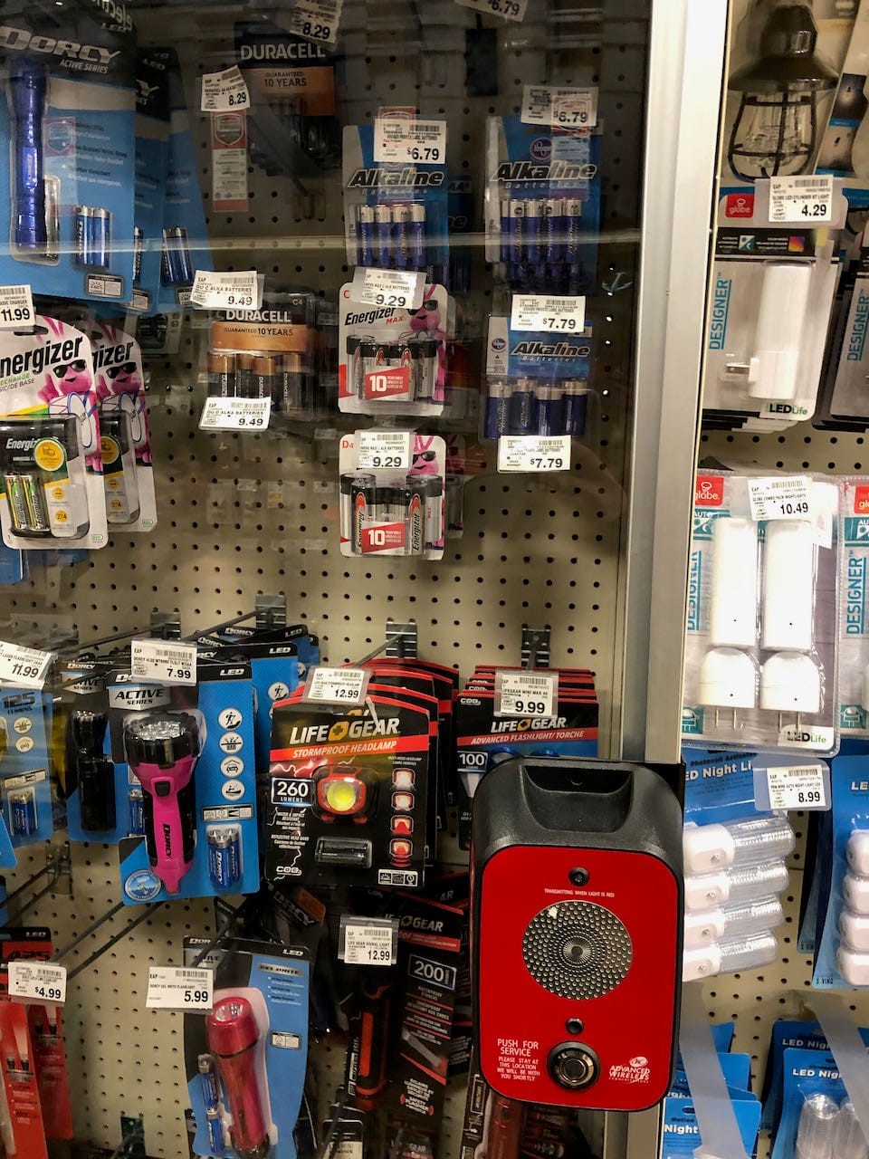 Flashlights are a bit more interesting of a question. They’re fairly inexpensive items and many have significant packaging. All of the flashlights are in a locked glass case. Nearby, similar lights and much more expensive power surges are not nearly under the same kind of security.