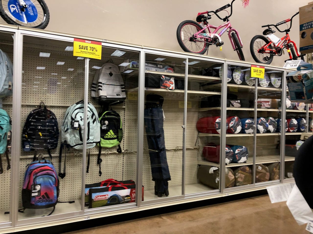 Placing backpacks and sleeping bags behind locked glass builds a picture of what theft this store thinks it needs to prevent.
