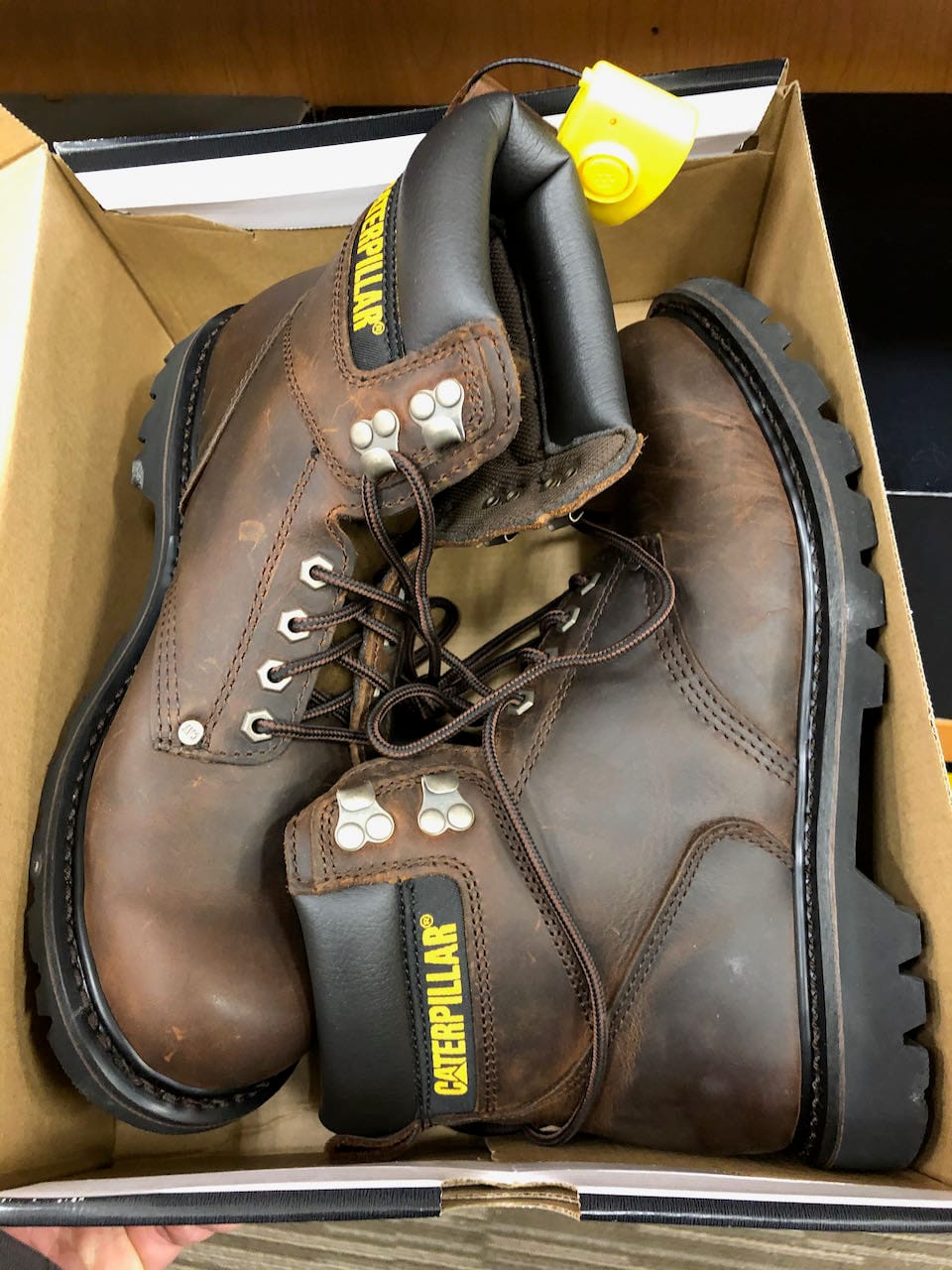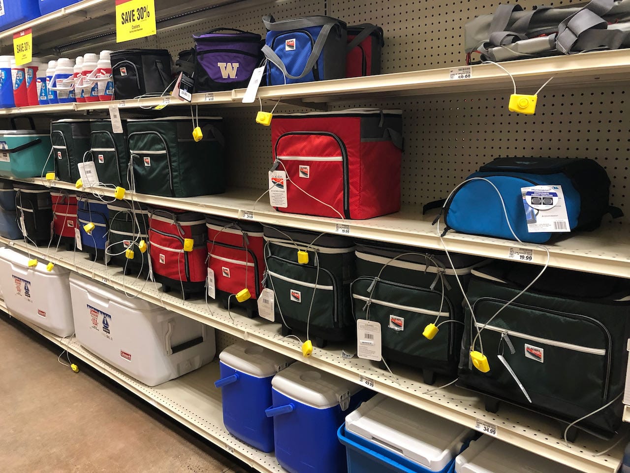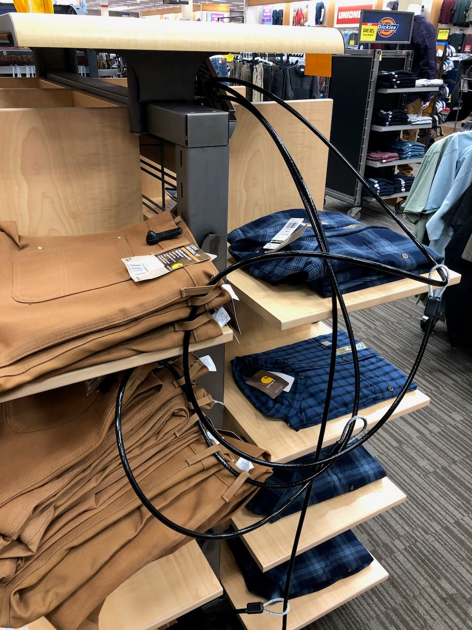 In another part of the store, the opposite back corner, more flashlights and headlamps are locked away along with camping goods. Security for gas and propane tanks inside a building seems really reasonable. It’s like the cages outside of the hardware store holding grill tanks. Safety rather than anti-theft. They’re secured, as are…coolers and sturdy work clothes and boots? Plenty of clothes have anti-theft tags on them, those little two-part pin devices that need the magnets at the cashier to remove. However, it’s really only the men’s pants that are attached to the shelves with a bicycle lock. Same with coolers and suitcases that are laced into the shelves with anti-theft wires.