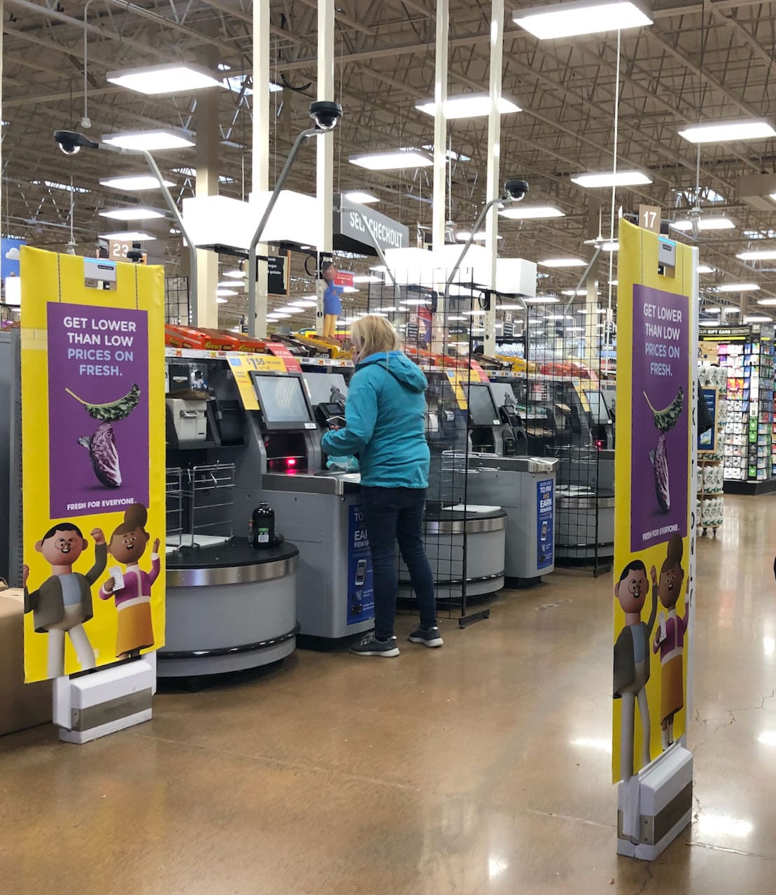The rule of sticking to the edge of the grocery store for healthy foods doesn’t apply to mixed retail like Fred Meyer. At the edges we end up in the staffless areas dedicated to furniture and toys and socks. As could be expected, there’s a lot more electronic tags here to prevent theft. Staff is more focused on reloading the shelves of potato chips that get emptied quickly. There’s naturally less notice of the areas in the corners that have lower turn over. But an interesting pattern emerges in how security is distributed.