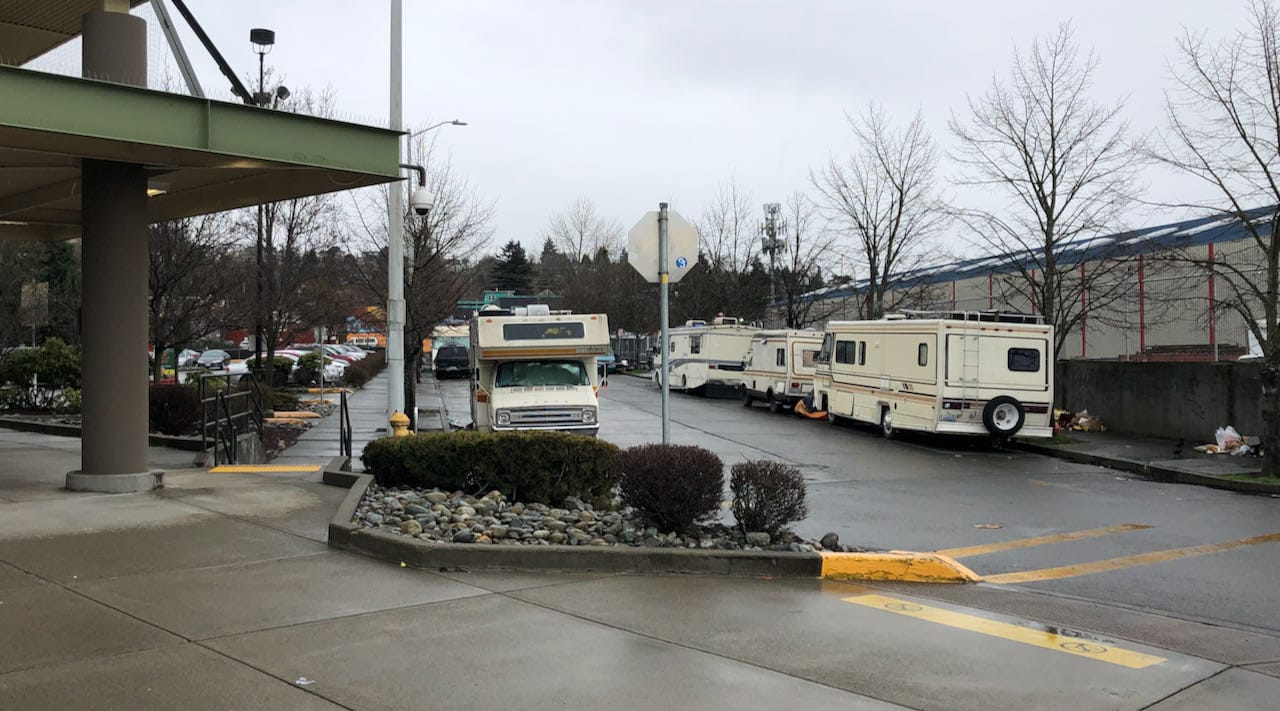 Which leads to a peek around the outside edge of the store that puts the flavor of this “security” into context. Fred Meyer and Grocery Alley are industrial. They are industrially zoned, car-dependent, waterfront areas. One of the few minimally humane things that the City of Seattle has done during this housing emergency and pandemic is slow the number of RVs that are towed from industrial areas. The fact of people living in vehicles outside is reflected in what Fred Meyer chooses to secure inside.
