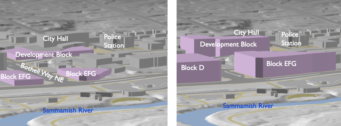 Future large developments in Downtown Bothell will most likely center on three properties owned by the City, a one-acre site known as the Development Block running adjacent to City Hall and two additional parcels, Block D and Block EFG, located on Bothell Way NE. All three properties are listed in the City’s future opportunities marketplace.