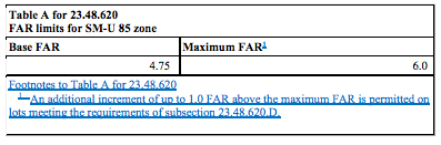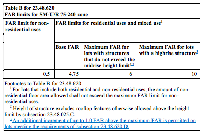 There has been a lot of conversation by community members over the issue of family-sized units. The proposed ordinance would allow a development proposal to unlock additional floor area allowances over the base maximum FAR if family-sized units are built, but the proposed amendment would go further in incentivizing the two- or more-bedroom dwelling units. Across the board, developments in SM-U zones could get an FAR boost above the absolute FAR maximums if they include family-sized units. So using the SM-U/R 75-240 zone as example, structures that don’t exceed the midrise height limit generally have a maximum FAR of 6.0. But if a development in that zone included family-sized units, the FAR could go to 7.0.