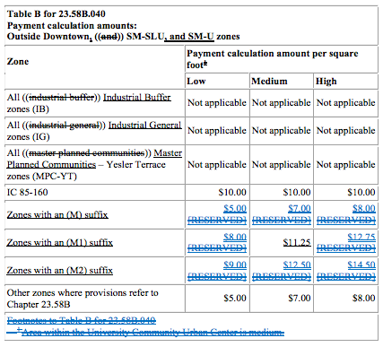 - Mandatory housing affordability. The Mandatory Housing Affordability (MHA) requirements appear poised to get a modest boost from the M1 type to the M2 type within the areas proposed for high-rise development. As proposed, the MHA-Commercial fee in-lieu (payment) requirements would jump from $20.00 to $22.25 per square foot of commercial space while on-site set-aside (performance) requirements would jump from 9% to 10% of total square footage to be set-aside as affordable housing, and the MHA-Residential fee in-lieu and on-site set-aside requirements could also see similar jumps to that of MHA-Commercial. The tables for other zones to become subject MHA requirements are also proposed to be filled in with definitive payment and set-aside amounts, though there have been some revisions to the tables since the last PLUZ Committee meeting. (NOT ADOPTED, for the M2 MHA proposal which are highlighted in Table A for 23.58B.040, Table A for 23.58B.050, Table A for 23.58C.040, and Table A for 23.58C.050; PASSED, for Table B for 23.58B.040 and Table B for 23.58B.050)