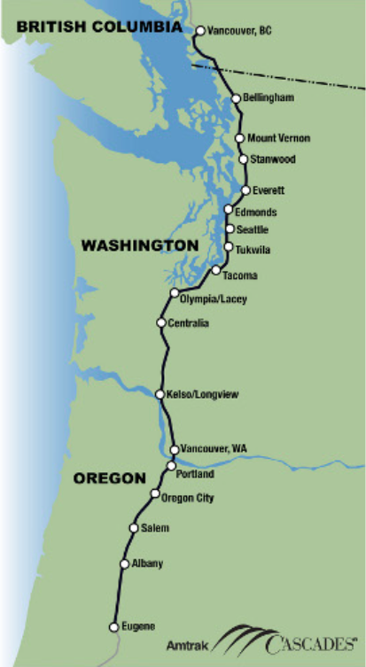 Washington State lawmakers have charted a path to double Amtrak Cascades service, but it’s not yet clear if they intend to actually fund that expansion. Their goal-setting legislation aims to cut the trip time from Seattle to Portland to 2.75 hours or less and to boost service to 14 daily trips with 88% on-time performance by 2035. The goal for trip time service north to Vancouver is 3 hours and 20 minutes. The speed goals would be about 25% faster than existing service, and the reliability targets would be a huge upgrade.