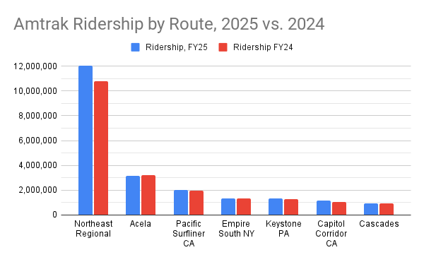 The Borealis, as a new service between Saint Paul, Minnesota and Chicago launched midway through 2024, did not have high baseline to disrupt. In fact, it led all lines with 140% growth, surpassing 212,000 boardings. The long-distance Empire Builder (from Seattle or Portland to Chicago) saw a 6% drop in ridership, logging 364,495 rides over the fiscal year. Some of its eastern ridership may have cannibalized by the Borealis.