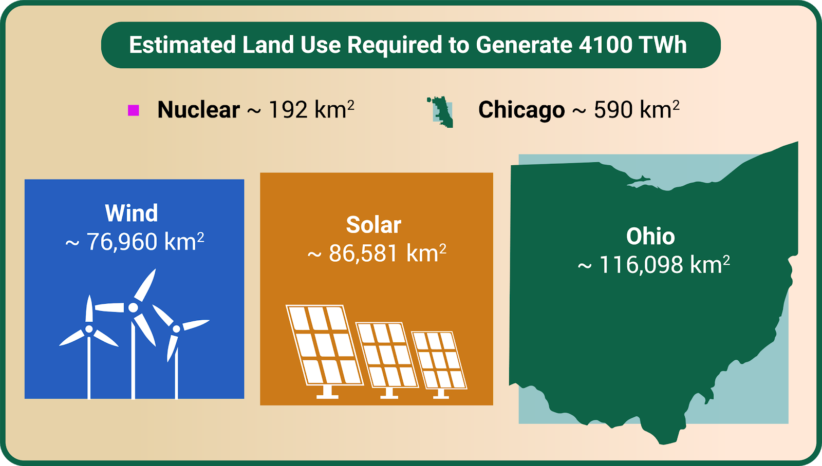 For solar, meeting a third of US energy needs by 2050 will take 11 thousand square kilometers (4250 square miles), or 4 thousand square kilometers (1550 square miles) if all the panels were in Arizona, industry-leading 21% efficient, and with horizontal installation with complete ground coverage as well. Calculating that number for wind is trickier, as there are vast swathes of land between each turbine. Jesse Jenkins, an assistant professor at one of Princeton’s engineering schools, found that 66,000 square kilometers (25,500 square miles) of wind farm would be needed for a third of US energy needs by 2050, but only 700 square kilometers (270 square miles) would be permanently taken up by production. The number for solar land use is also mitigated if coverage is distributed across rooftops for solar, but it does not eliminate the significant land usage of either of the two renewables.