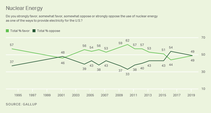 Public sentiment poses the greatest challenge to the viability of nuclear power. Gallup polling in 2019 had nuclear power equally favored and opposed by 49% of the American public. On emphasis, Gallup found that roughly a third of surveyed Americans supported more, less, or the same emphasis each. The pollster correlated perceptions on cost and safety with nuclear power’s favorability, which declines whenever an incident occurs or when oil is cheap. These numbers certainty aren’t bleak as one might imagine, but Gallup found that its renewable counterparts to be much more popular with their cleaner image and now rosy economics.