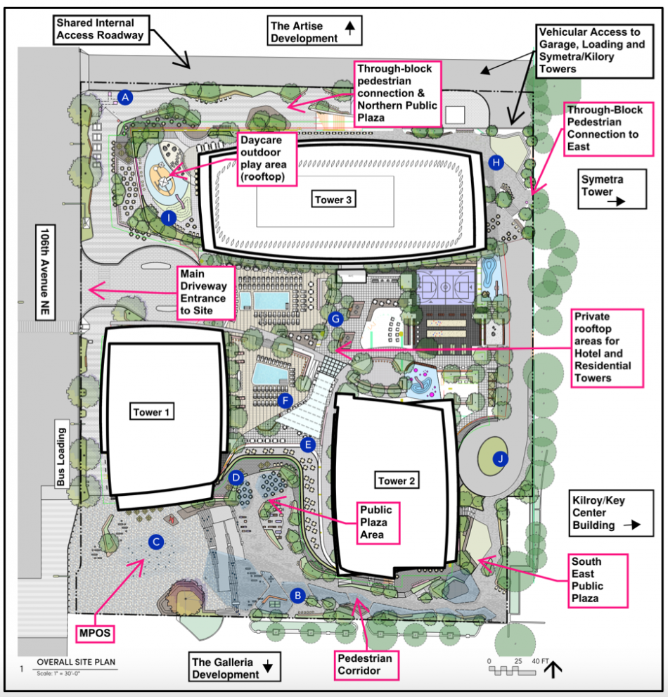 The newest public access pathway in Downtown Bellevue is at West Main or 117 106th Ave NE. West Main’s public access corridor is a flat and green alterative to 105th Avenue NE’s sidewalk and creates an east-west connection on the three tower block.