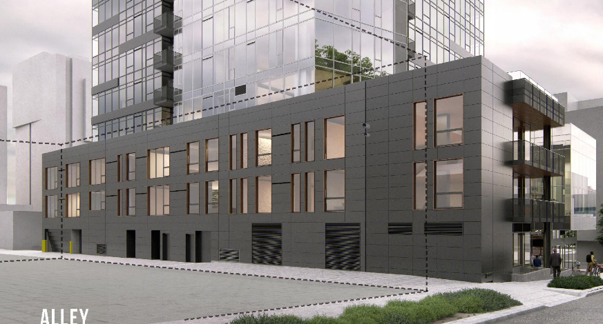 The tower would replace surface parking and one- and two-story office buildings that currently host a glassblowing supply store and Public47 Architects. Across the alley, Greystar is planning a 28-story apartment tower of its own with 374 units on the site of Seattle Unity Church.