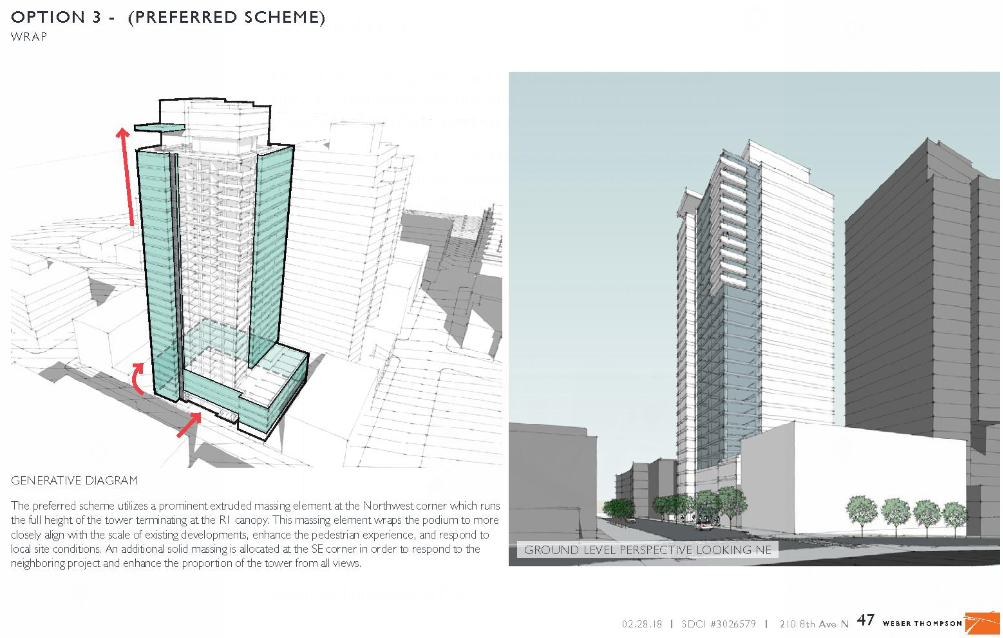 The design review will happen at the Queen Anne Community Center following the 6:30pm design review of a nine-story office tower at 330 Yale Ave N. It will be the 820 John St project‘s second design revew; the first early guidance guidance meeting happened in April 2017. If the board isn’t satisfied with the design, the project could be required to come back for a third review.