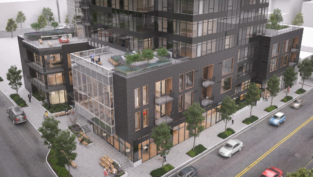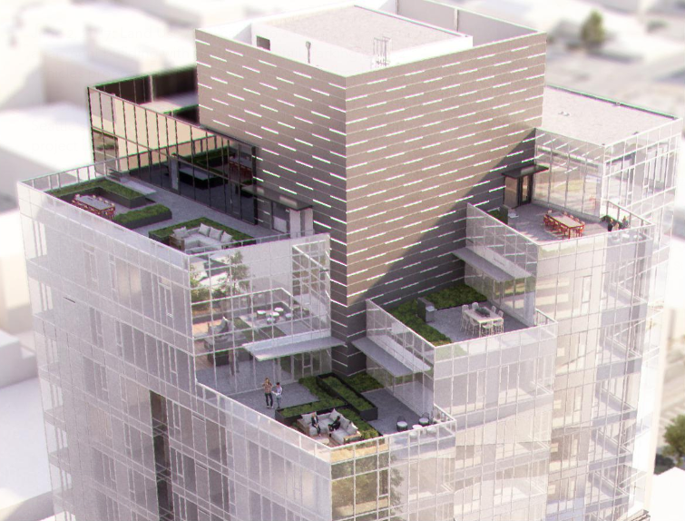 Ankrom Moisan opted to orient the tower south to Denny Park with a “phototropism concept” that maximized south-facing windows like a plant bending toward the sun. The tower has a stepped roof to maximize rooftop outdoor space. The developer actually needs a code departure since for some reason the Seattle land use code caps rooftop features at 65% coverage and this design manages 72% with its stepped design, which is encouraged in other parts of the code. (I don’t envy architects when it comes to deciphering complexities like that.)