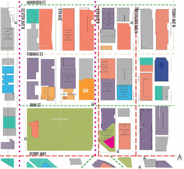 Ninth Avenue is already a hive of construction activity with construction often interrupting the street’s bike lanes. Across the street, a seven-story apartment building is under construction with a 12-story office just to the north. A seven-story office at 308 9th Ave N just received its permit in January and a 25-story residential tower and a 26-story tower have cleared design review but appear to be in the process of altering plans to opt into Mandatory Housing Affordability (MHA) rezones.
