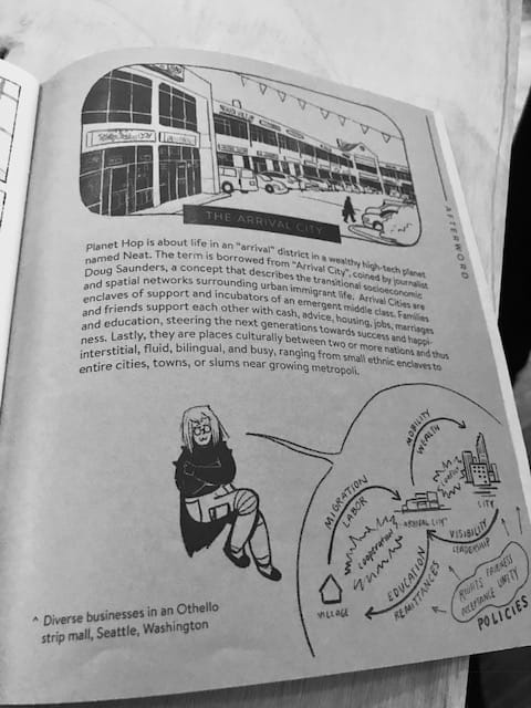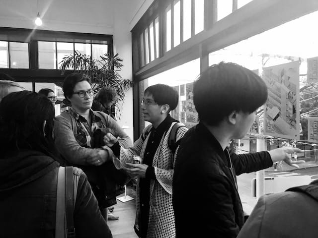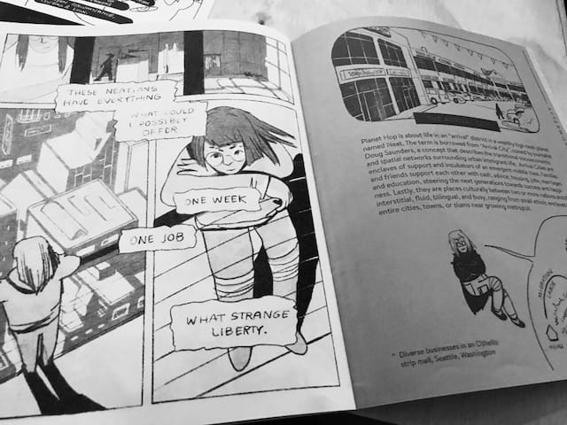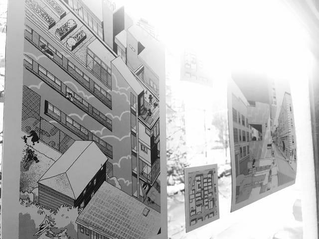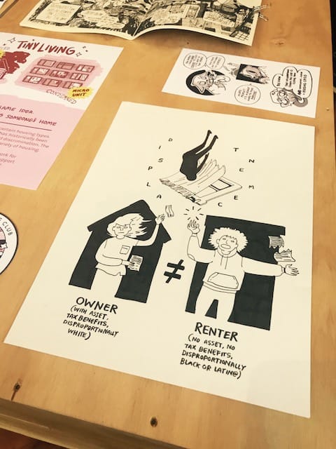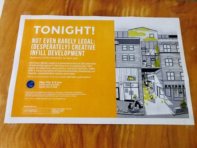 Local queer, Latinx artist Myra Lara held a very well attended art opening at Hybrid_Space last week. Not Even Barely Legal: (Desperately) Creative Infill Development included a mix of architectural sketches, comics, and is grounded in activism. Myra Lara is a thoughtful, talented artist who is foucsed on education and advocacy for spatial justice.